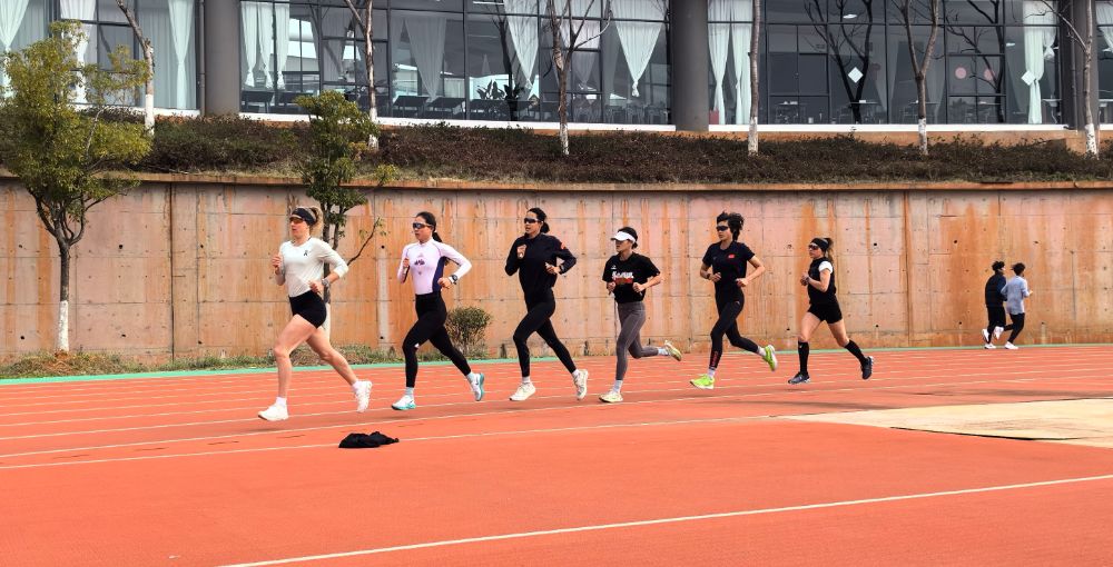 Entraînement de course à pied avec des athlètes chinoises à Yuxi: Julie Derron donne le tempo (màd).