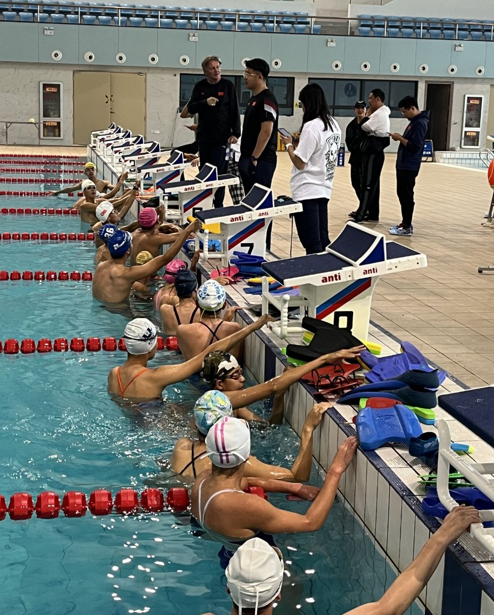 Entraînement de natation dans une piscine couverte en Chine – au fond à gauche, debout, le coach Brett Sutton (màd).