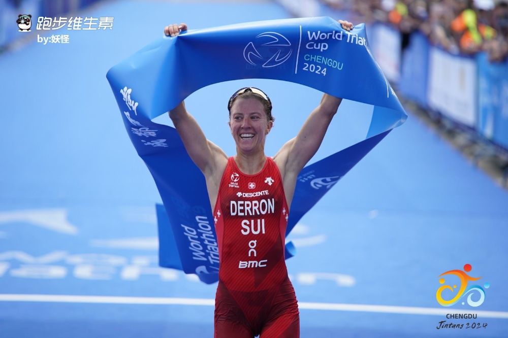 Julie Derron à l’arrivée. Ici, lors de sa victoire de la Coupe du Monde de triathlon en 2024 à Chengdu en Chine (màd).