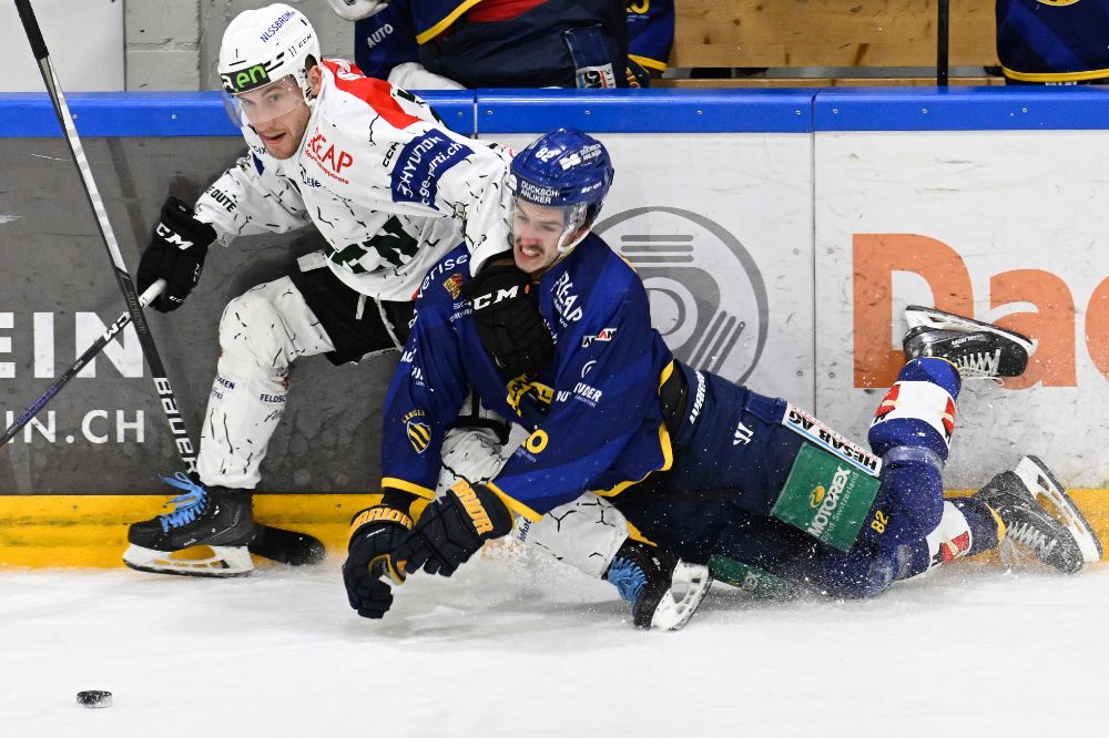 Luca Wyss (en bleu) et son club sont restés accrochés à leur adversaire d’Olten en quart de finale des play-offs – c’est la fin pour Langenthal. (KEYSTONE-SDA)