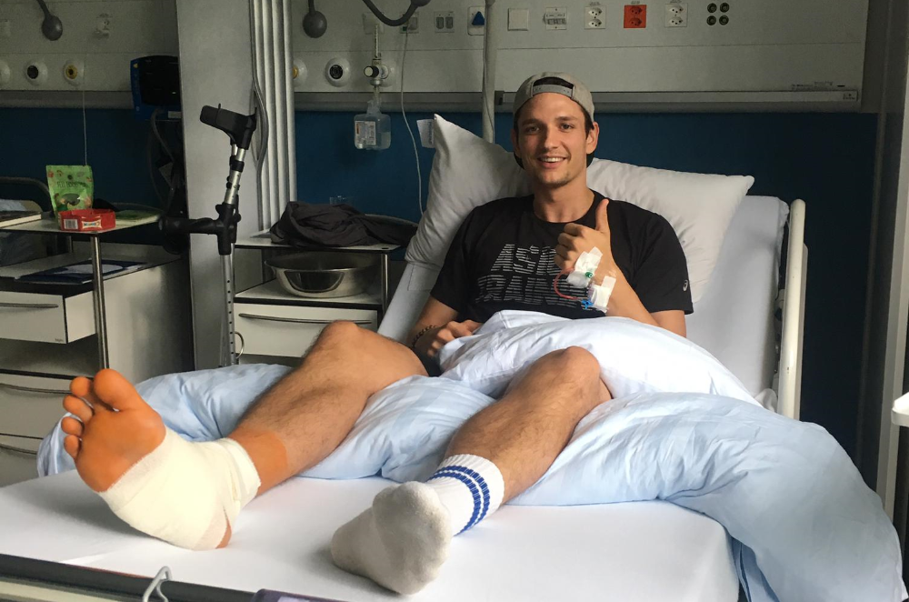 Six semaines plus tard, je reprends l’entraînement. Après ma première séance avec Wacker Thun, je ressens des douleurs au pied, mais je pars quelques jours plus tard au rassemblement de l’équipe nationale en espérant que cela ira quand même. Comme les douleurs persistent, je les mets sur le compte de mon activité accrue et compte simplement interrompre l’entraînement collectif pour quelques jours. Alors que j’accompagne chez le médecin un coéquipier de l’équipe nationale qui s’est foulé le pied, je décide d’en avoir le cœur net et passe moi aussi une tomographie. « M*** ! Ça va être chaud pour les Championnats d’Europe », me dis-je lorsque le médecin m’annonce que mon pied est de nouveau cassé. Une nouvelle opération n’est pas envisageable, car elle sonnerait le glas de mes rêves de Championnats d’Europe.