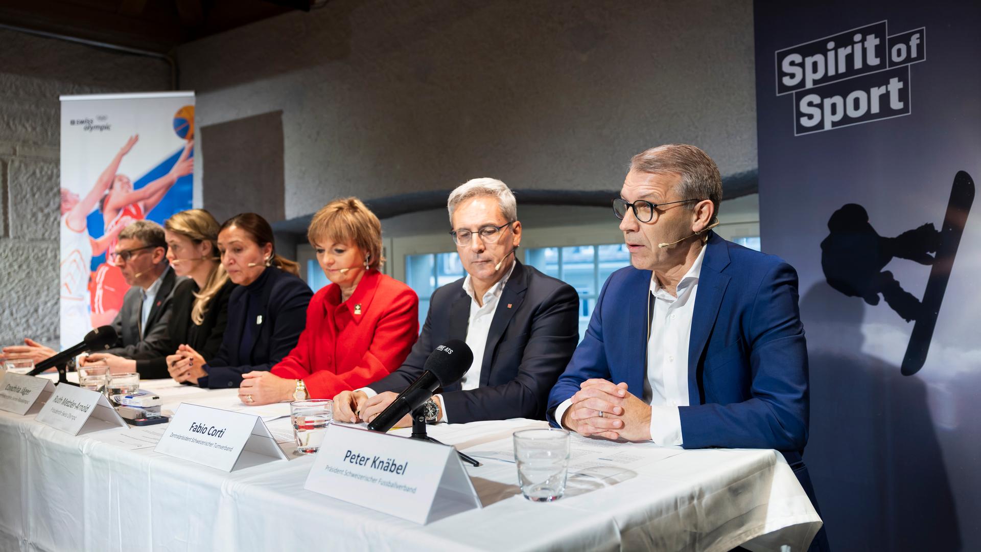 Ruth Metzler-Arnold (Präsidentin Swiss Olympic), Andrea Siviero (Präsident Swiss Basketball), Luana Bergamin (Geschäftsführerin SwissTopSport), Conchita Jäger (Geschäftsführerin Swiss Paralympic), Fabio Corti (Präsident Schweizerischer Turnverband) und Peter Knäbel (Präsident Schweizerischer Fussballverband), stellten an der Medienkonferenz den Wert der SRG für ihren Verband, für ihre Vereine, für ihre Sportlerinnen und Sportler unter Beweis.